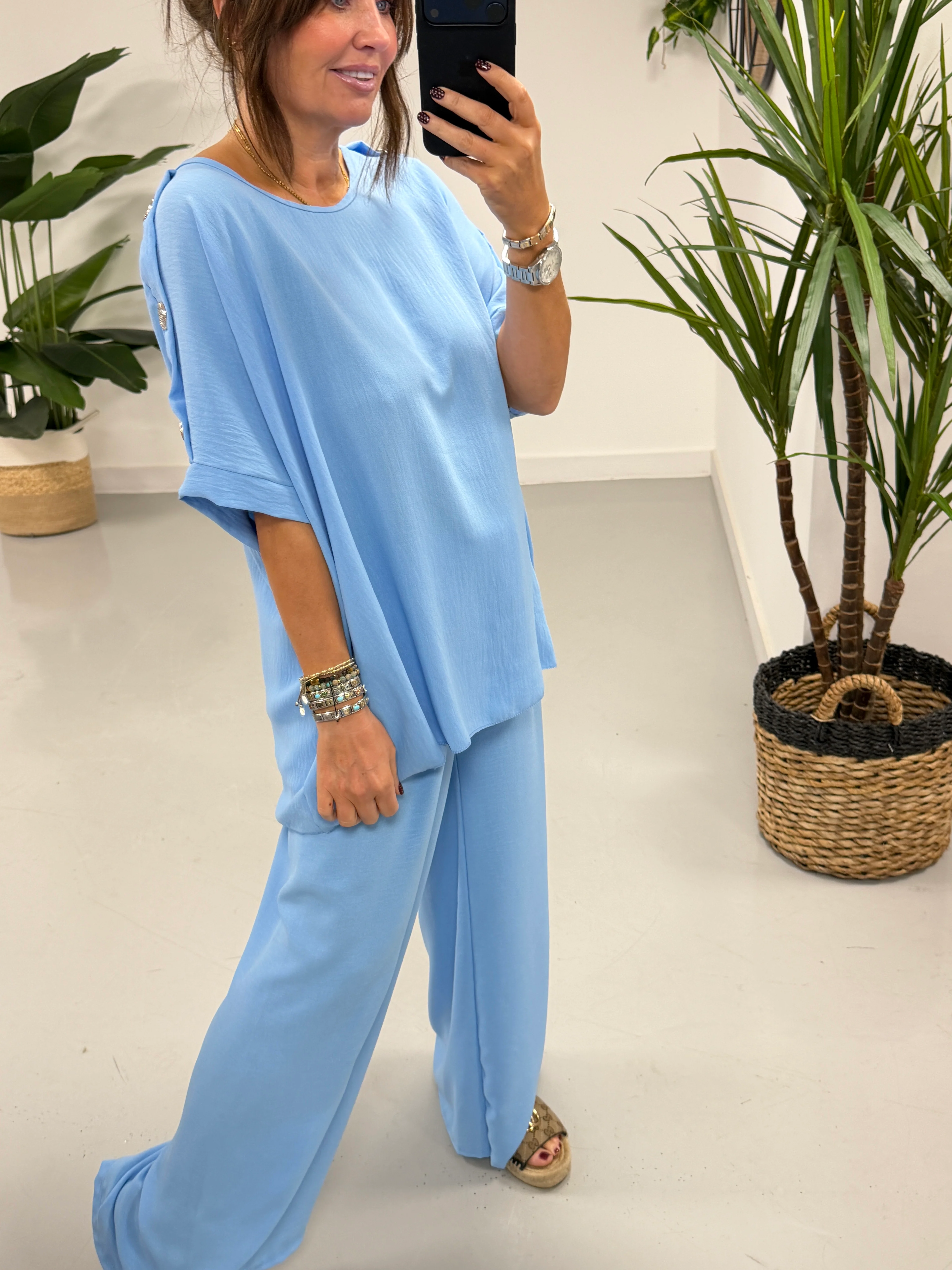 Set comprises of a boxy tunic with gold buttons running down the shoulder and an elasticated waist wide leg trouser….