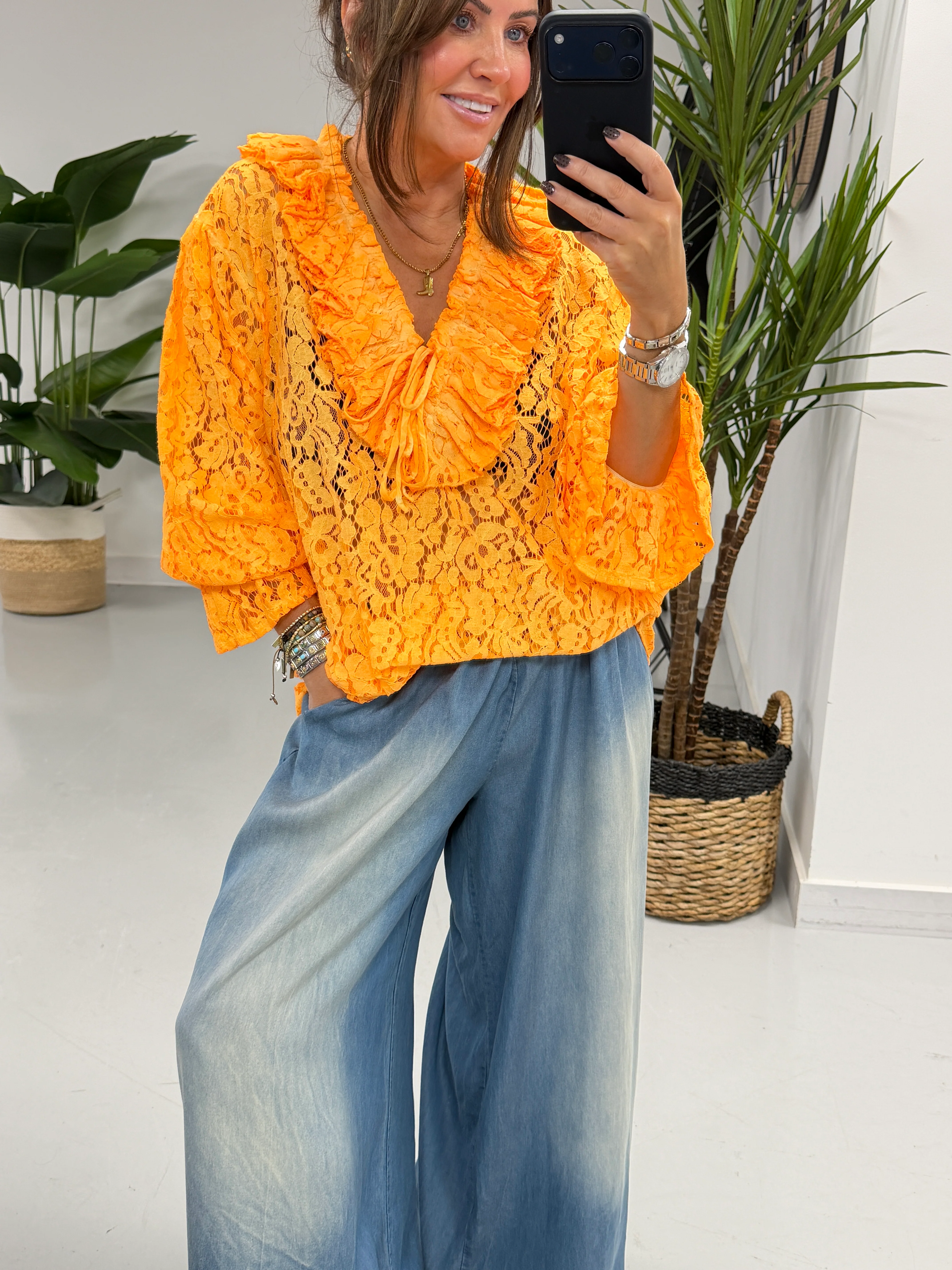 The super popular Ruffle Tie Blouse now comes in the stunning bold and vibrant lacefabric… and we are absolutely feeling it…