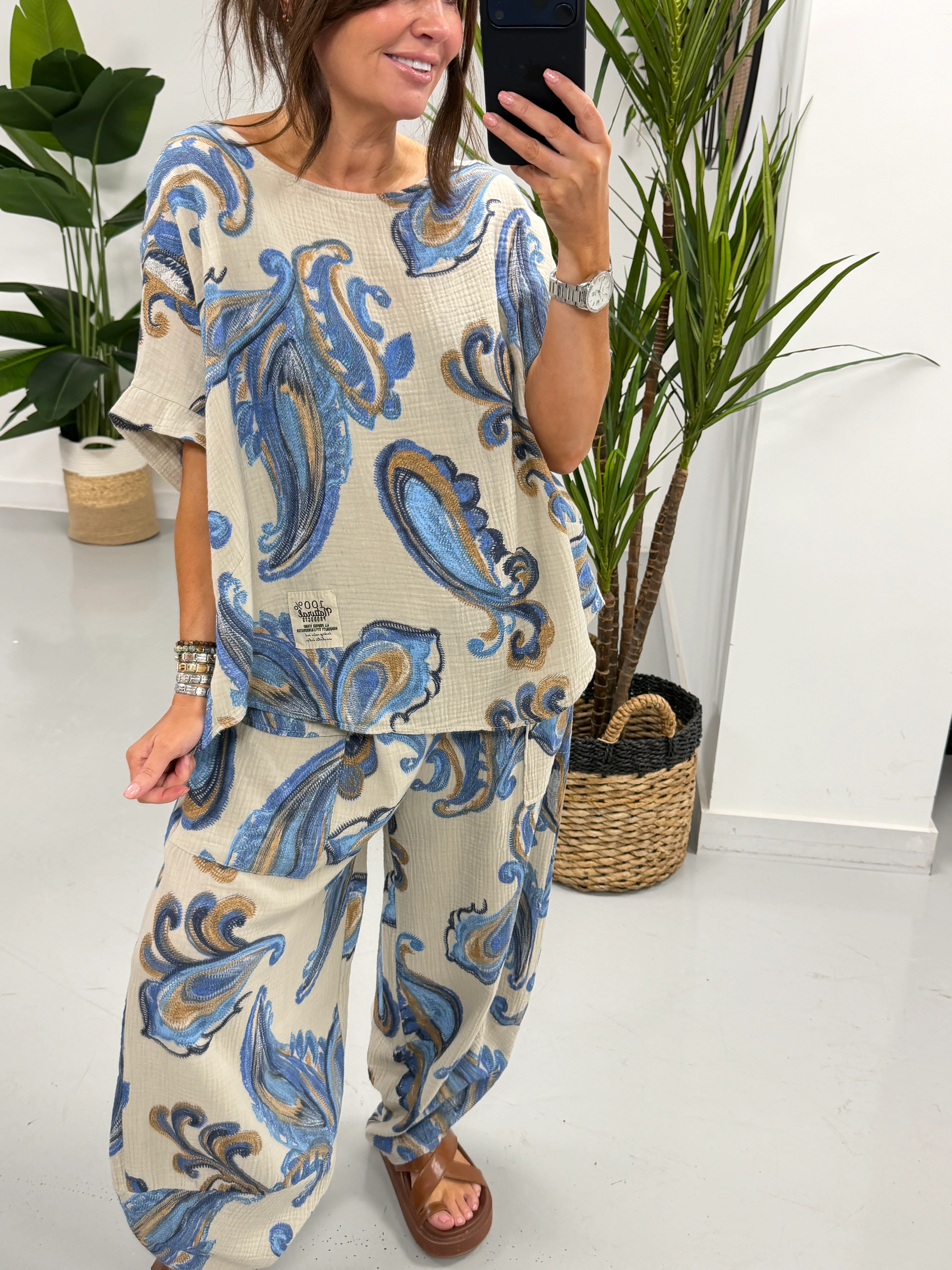 The bold paisley print on the neutral tone base is just stunning…relaxed-fit top features elegant gold button detailing along the shoulders, adding a subtle statement touch to the simple silhouette. Paired with comfortable elasticated waist trousers with tulip hem trouser creating a relaxed fit that moves beautifully and feels great to wear.